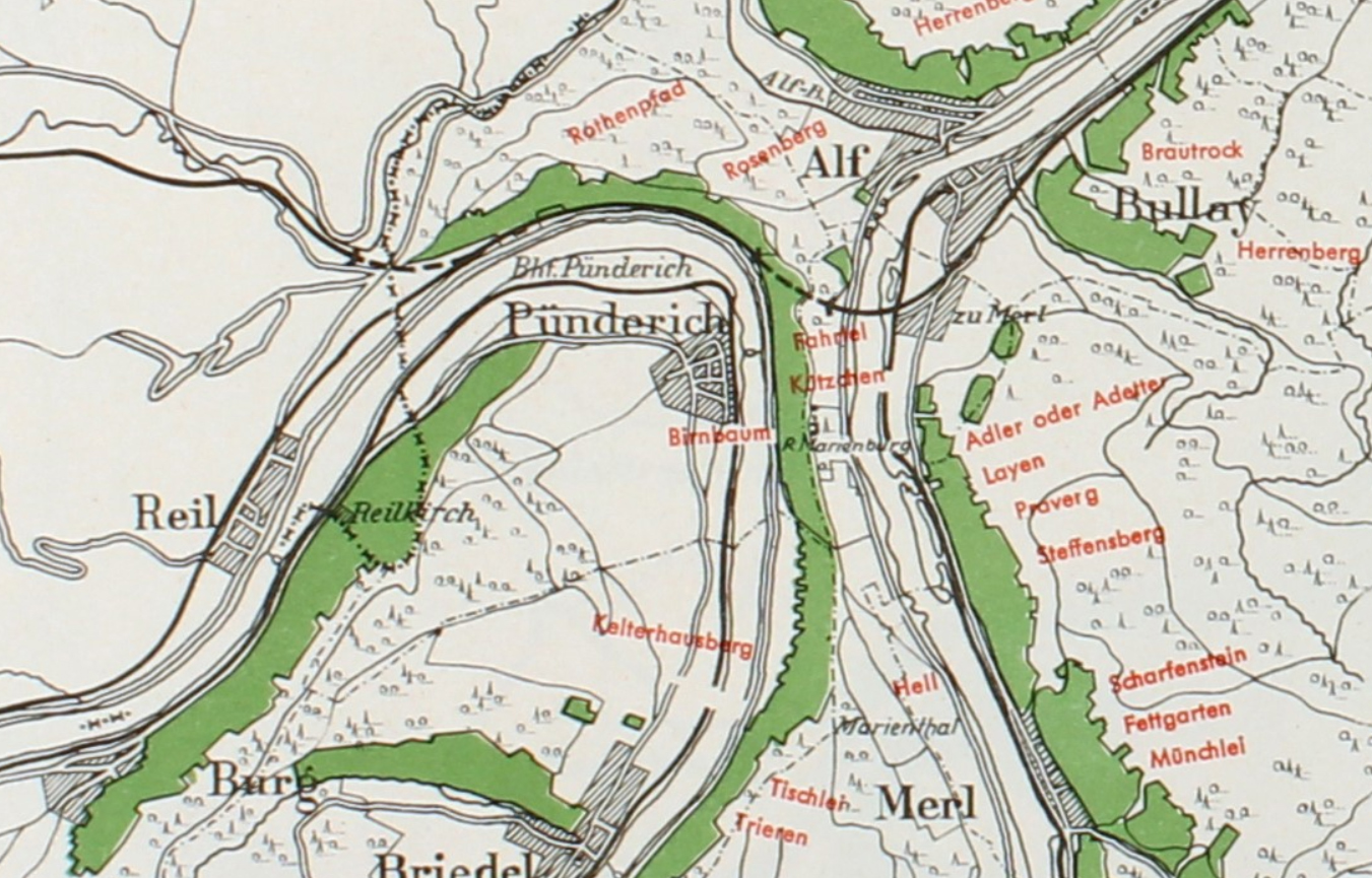 Her havde Clotten også fat i den dybrøde pensel. Parcellen “Fahrtel” i dag “Fahrlay” på det vi i dag kender som Pündericher Marienburg opnåede høje priser. Vinmager Clemens Busch producerer i dag fra parcellen “Raffes”, vin fra stejl parcel der ikke har gennemgået flurbereingung. Lidt besynderligt er det, at parcellen “Rothenpfad” i dag ligger brak. Sidst i 1800-tallet regnet for at være en af de bedste marker i området. Mon ikke den bliver beplantet igen en dag.