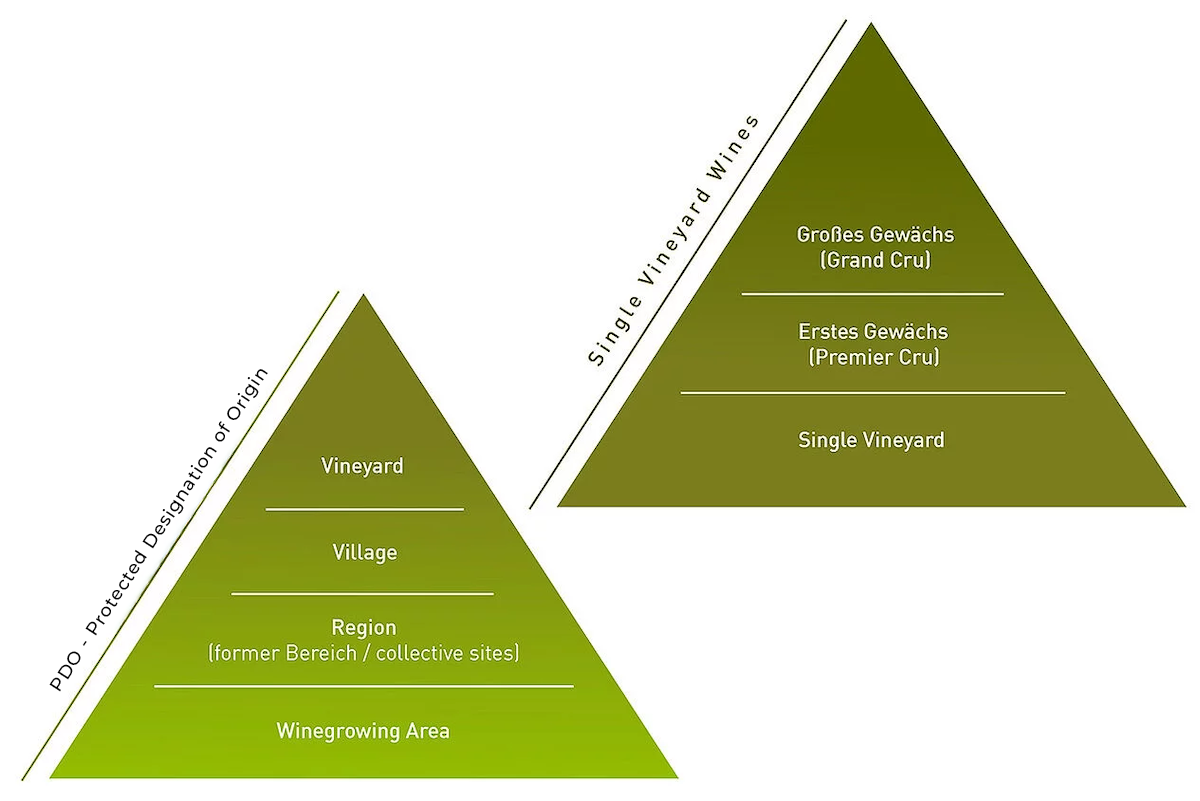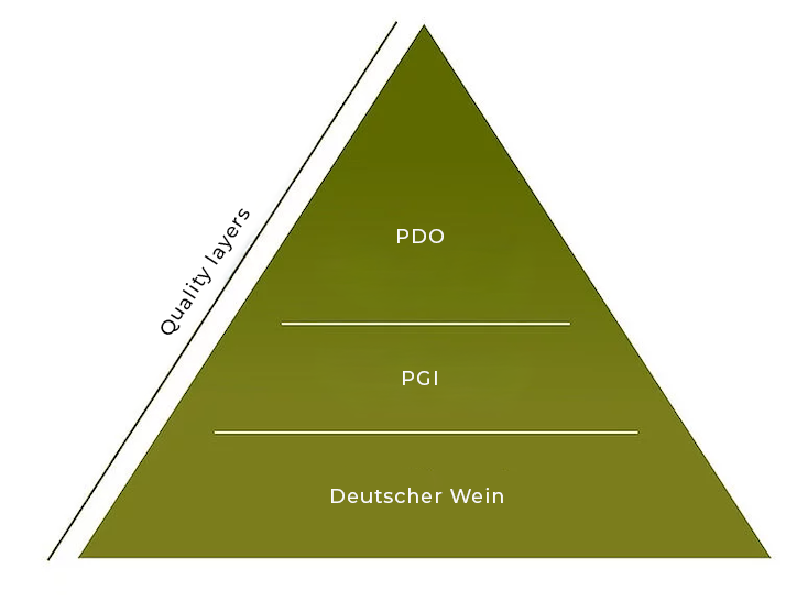 Systemet er opbygget som en pyramide, jo mindre afgrænset et område er, jo tættere er du på toppen, – som oftest også kvalitetsmæssigt. PGI, som er EU-niveauet under PDO, træder nu i stedet for “Landwein”, og laveste kategori er “Deutscher Wein”.