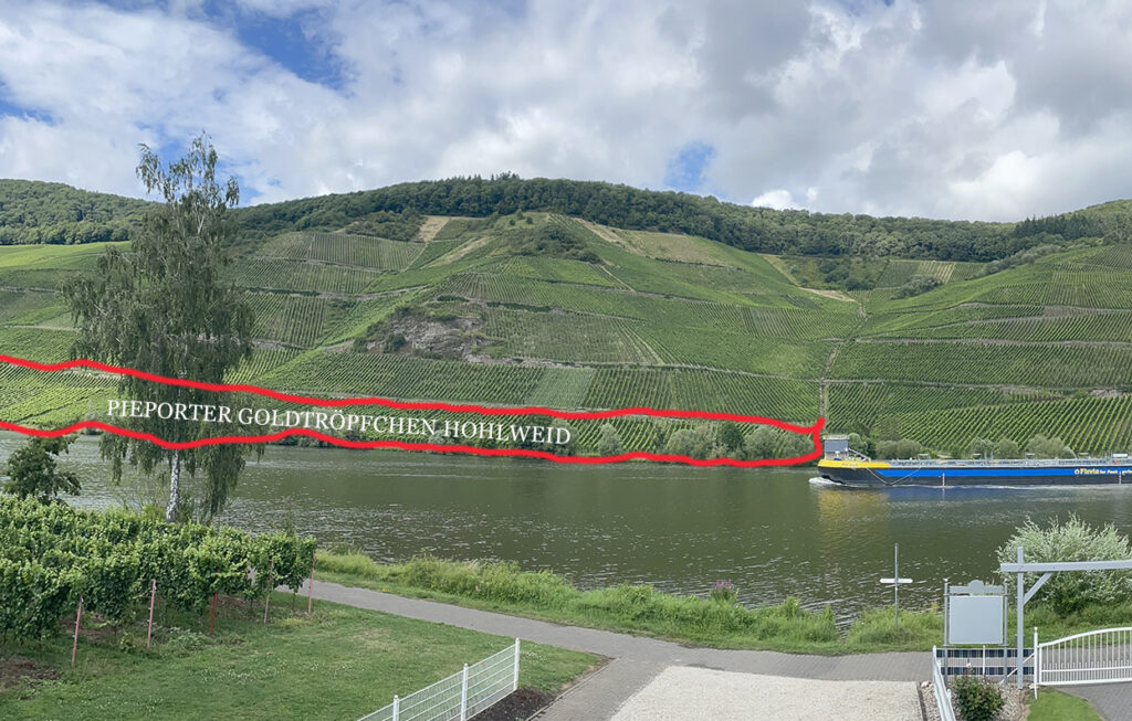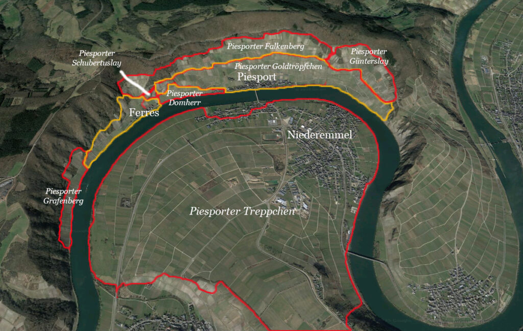 På kortet er indtegnet Piesports største Einzellagen. Den nuværende inddeling (2025) ved Piesport er lige så misvisende som alt andet skabt i 1971. Goldtröpfchen er indtegnet med gult. 85 hektar stor, med markparceller både på stejle skiferskråninger, samt i mere forvitret skifer og sågar lerjord. 1971-lovgivningen beviser her, at den er mere vildledende end vejledende. Der kan selvsagt være kæmpe stilforskelle indenfor samme Einzellage. Det viser de tre gewanne på Goldtröpfchen (mindre markparceller) Gruft 0,5 ha, Hohlweid 5 ha og Armes 1,8 ha meget godt. Hohlweid er altid den modne fyldige vin fra den forvitrede granit nærmest floden, imens Gruft og Armes ligger højt og stejlt, med begrænsede vandreserver. De to sidstnævnte skaber altid mere ranke, syreholdige vine.