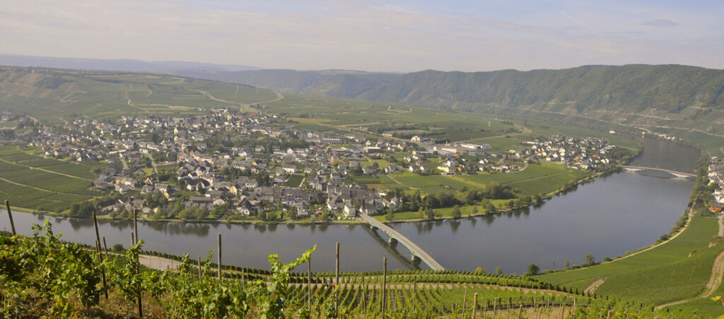 Moselfloden løber her i 114 meters højde, vinmarkerne når helt op i 350 meter, og bakketoppene op i over 400 meter. Det betyder god afskærmning for vind og regn, og så suger den direkte sydvendte skråning solen til sig.